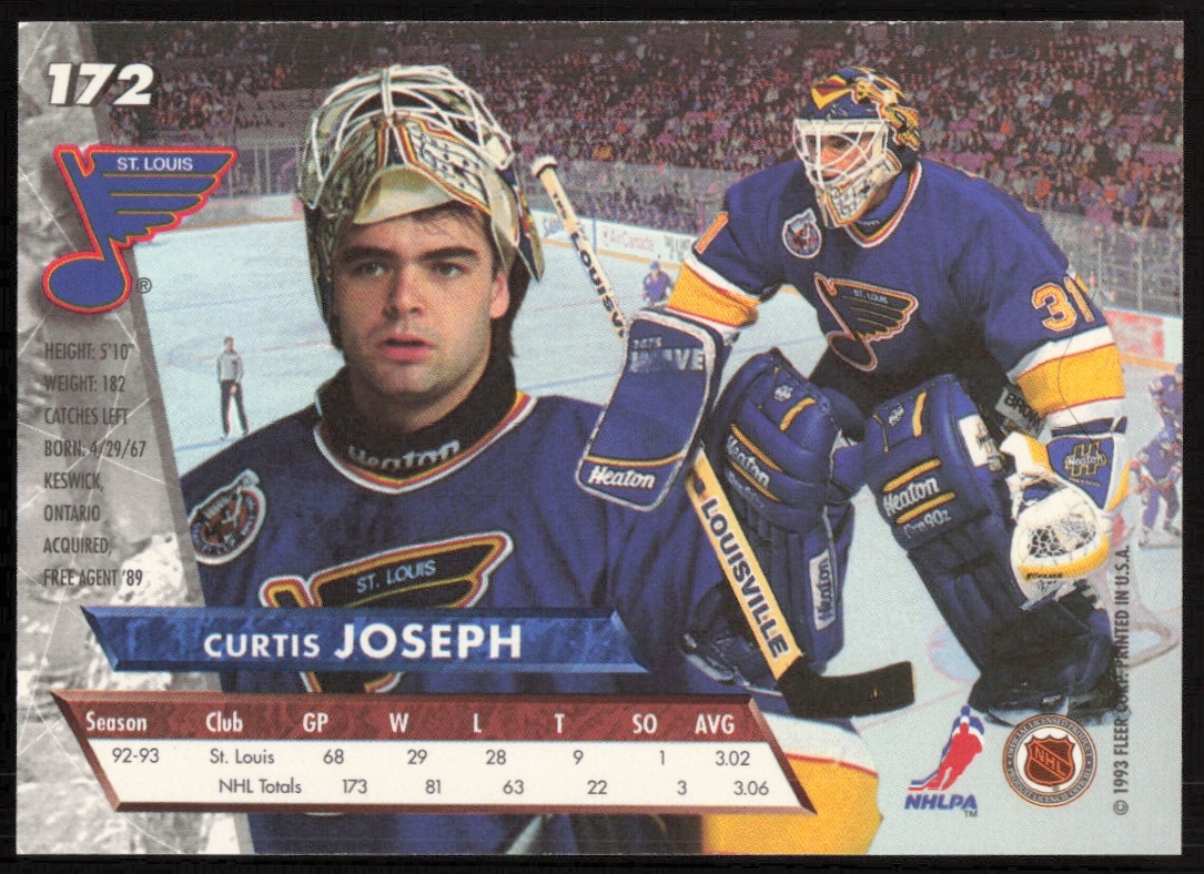 This Hockey card, from 1993-94 is part of the Fleer Ultra card set. Curtis Joseph is featured and has a card number of 172.