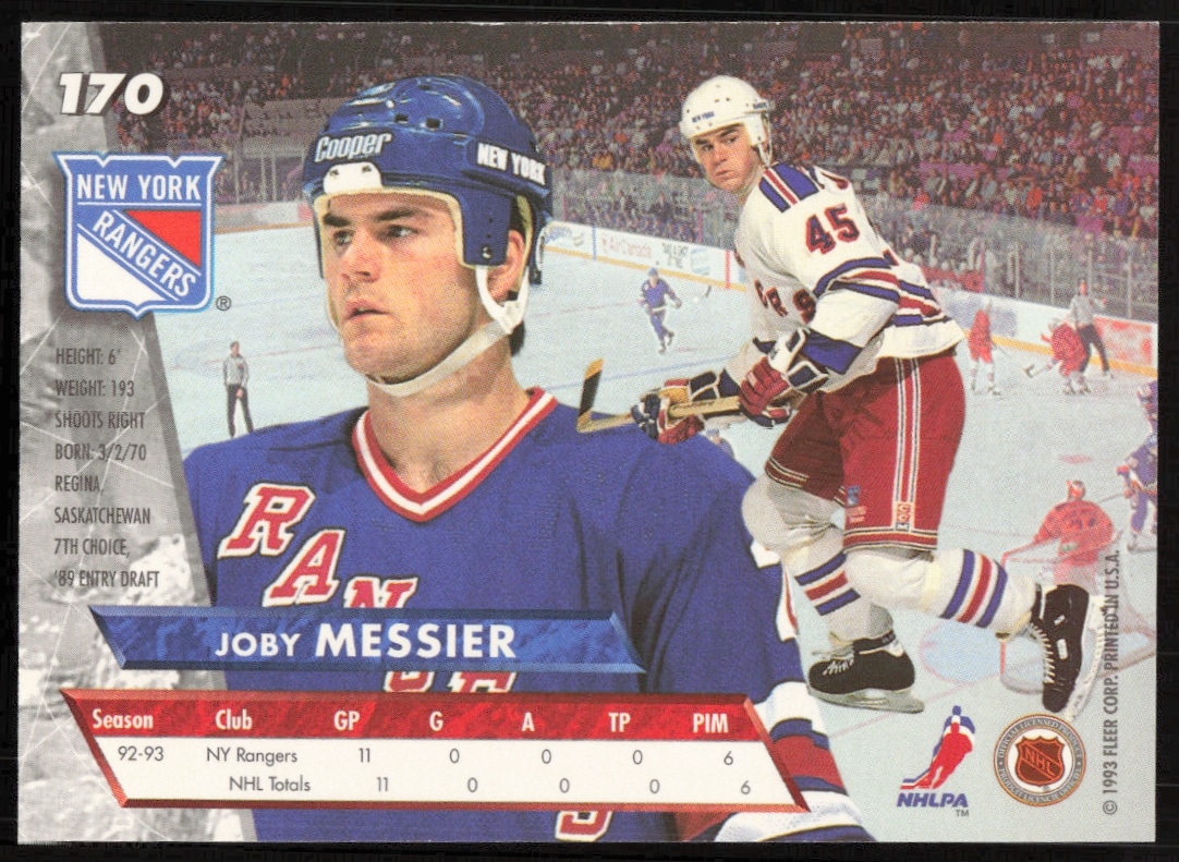 This Hockey card, from 1993-94 is part of the Fleer Ultra card set. Joby Messier is featured and has a card number of 170.