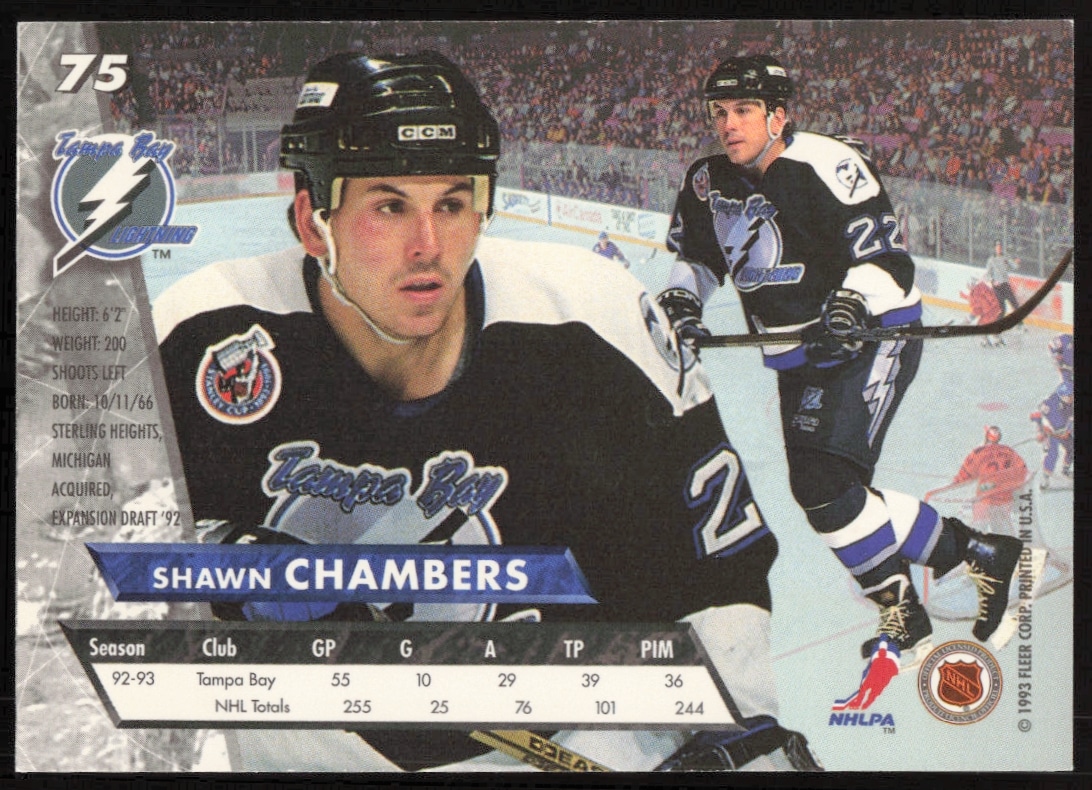 This Hockey card, from 1993-94 is part of the Fleer Ultra card set. Shawn Chambers is featured and has a card number of 75.