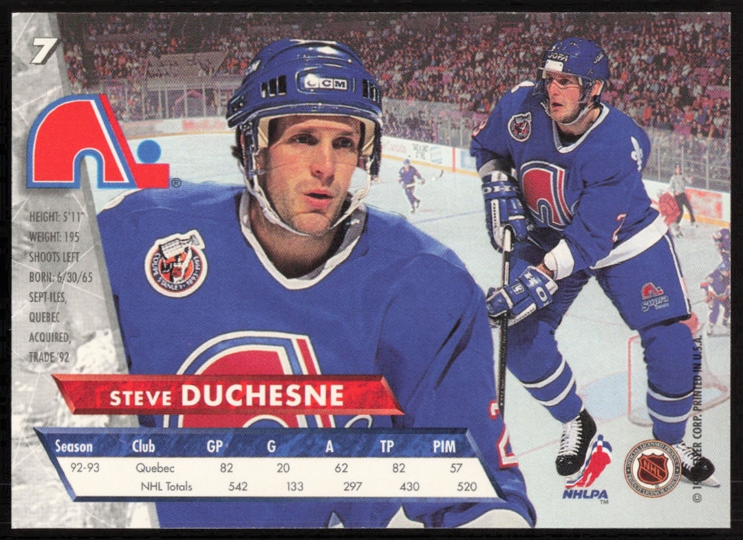 This Hockey card, from 1993-94 is part of the Fleer Ultra card set. Steve Duchesne is featured and has a card number of 7.