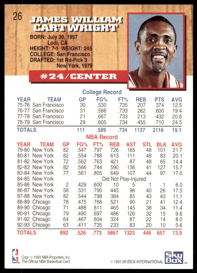1993-94 Skybox NBA Hoops Series 1 Bill Cartwright #26