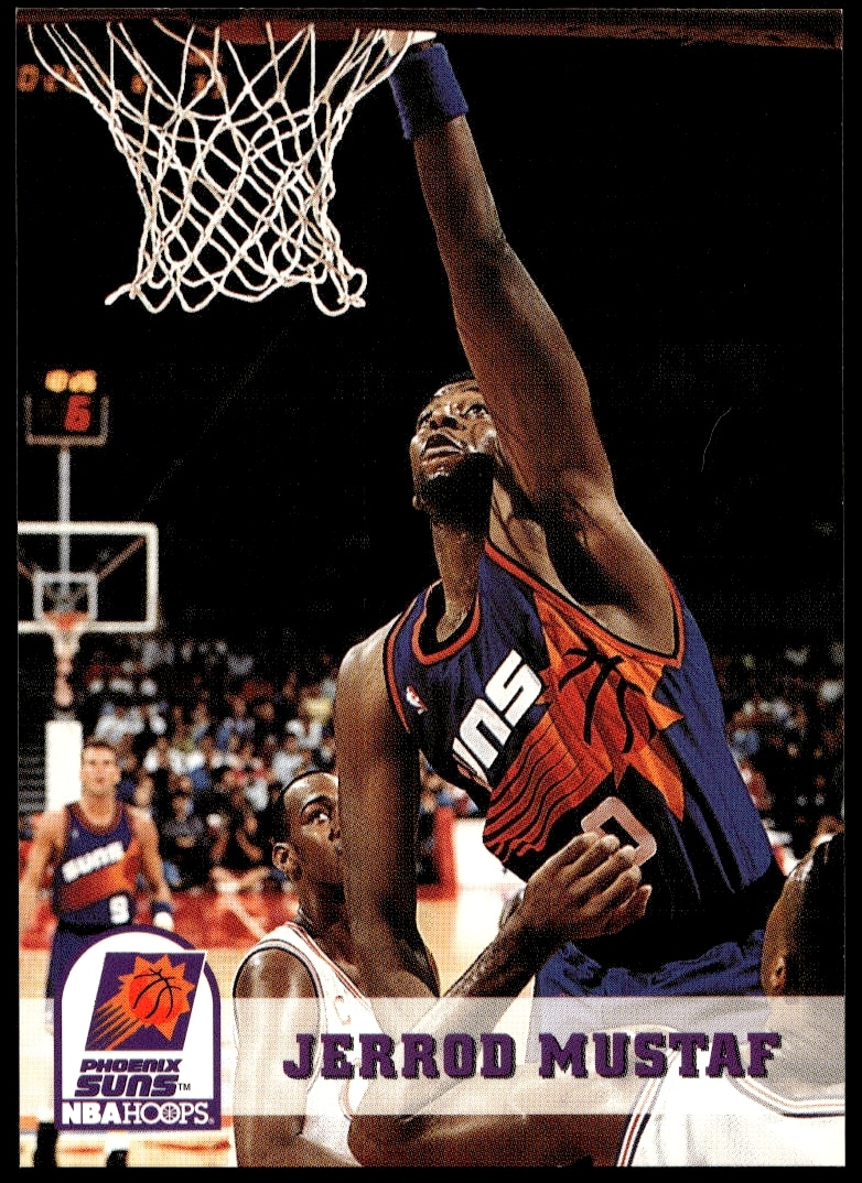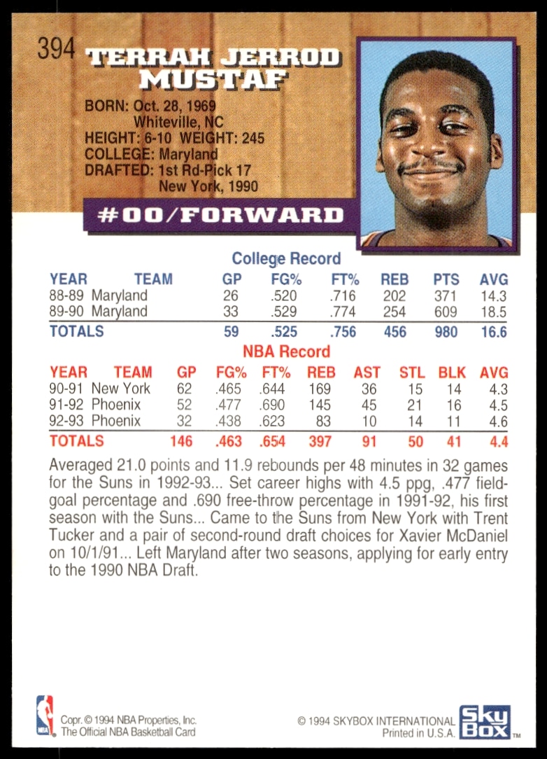 This Basketball card, from 1993-94 is part of the Hoops card set. Jerrod Mustaf is featured and has a card number of 394.