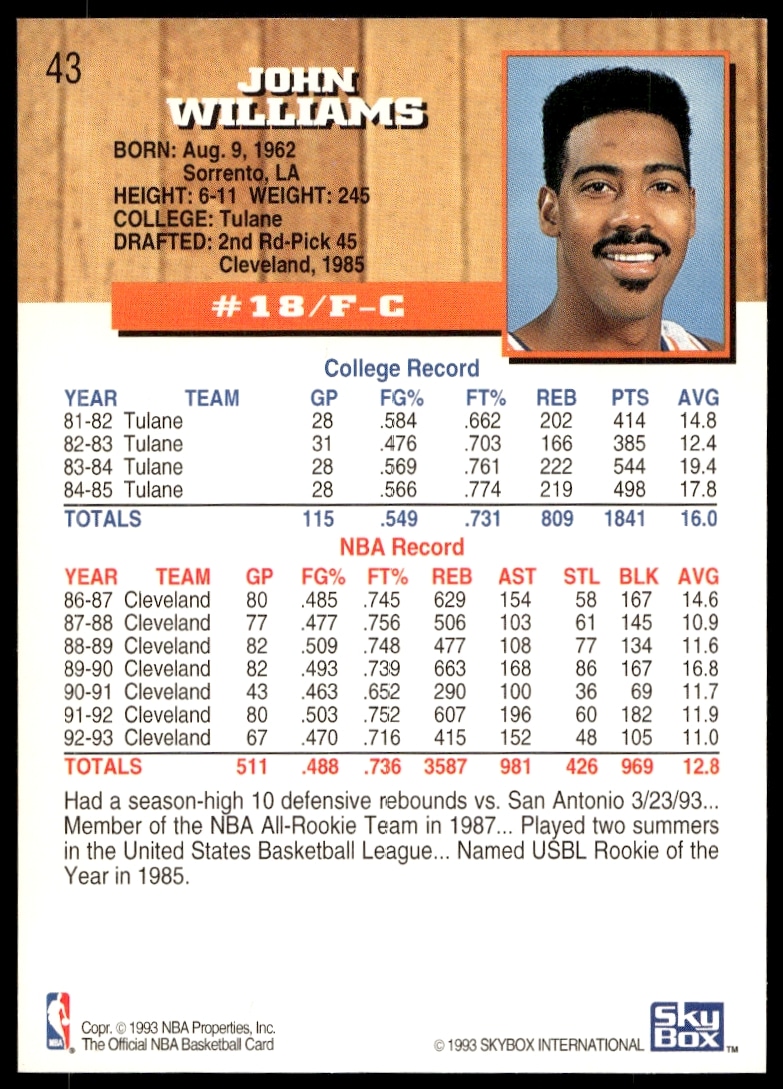 This Basketball card, from 1993-94 is part of the Hoops card set. John Williams is featured and has a card number of 43.
