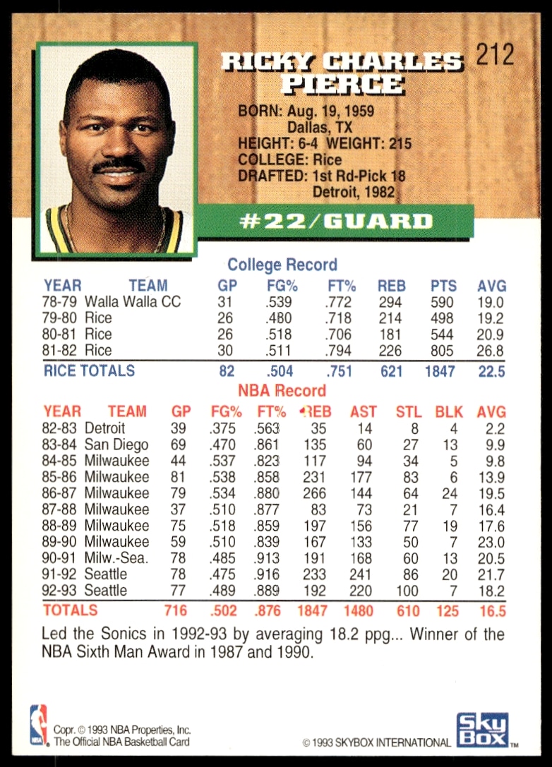 This Basketball card, from 1993-94 is part of the Hoops card set. Ricky Pierce is featured and has a card number of 212.