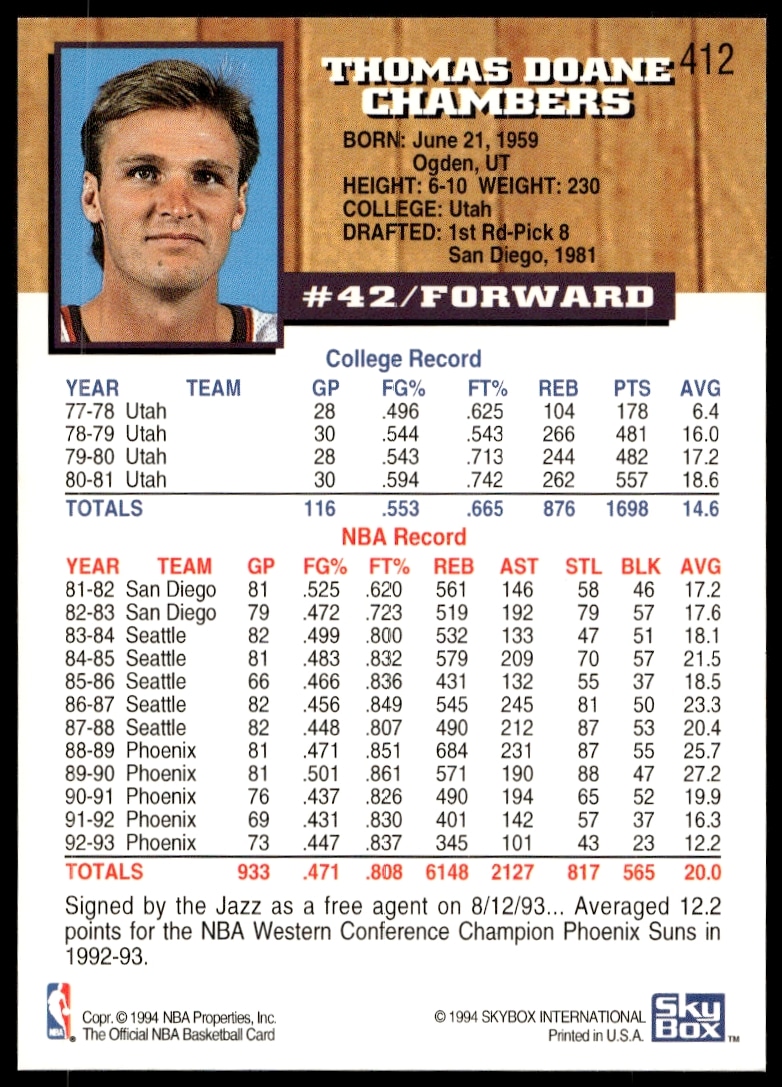 This Basketball card, from 1993-94 is part of the Hoops card set. Tom Chambers is featured and has a card number of 412.