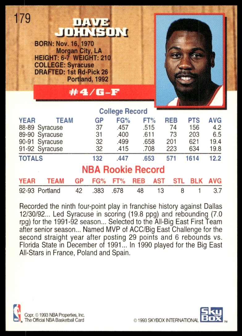 This Basketball card, from 1993-94 is part of the Hoops card set. Dave Johnson is featured and has a card number of 179.