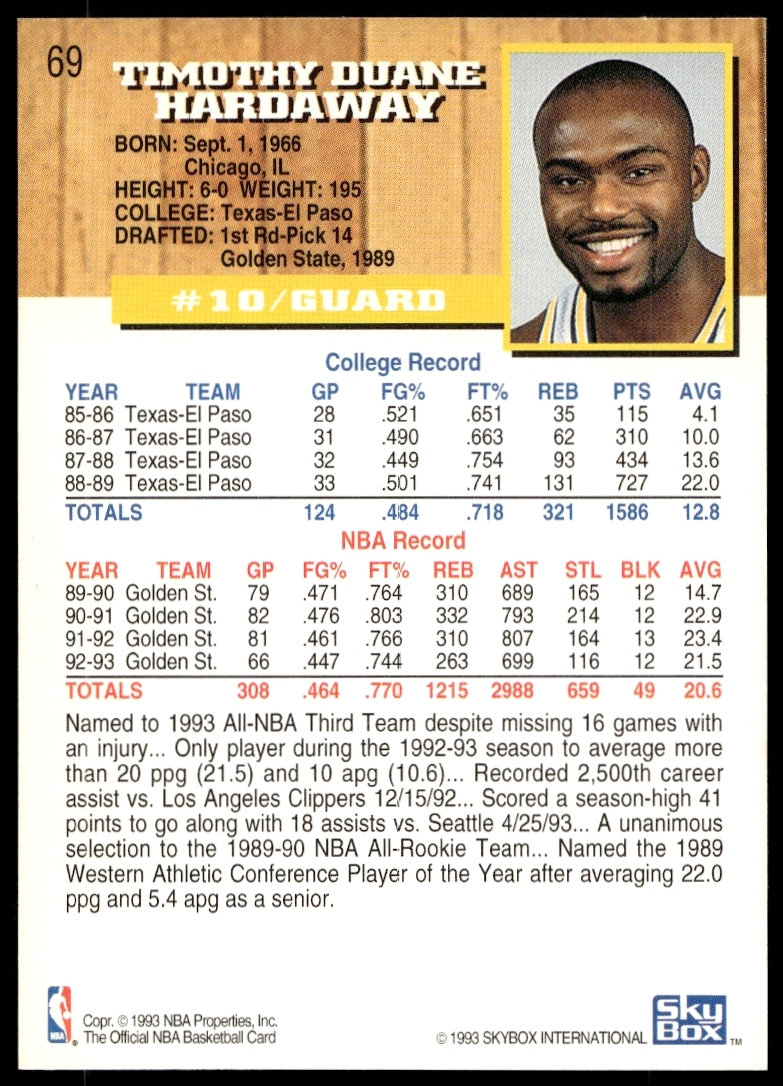 This Basketball card, from 1993-94 is part of the Hoops card set. Tim Hardaway is featured and has a card number of 69.
