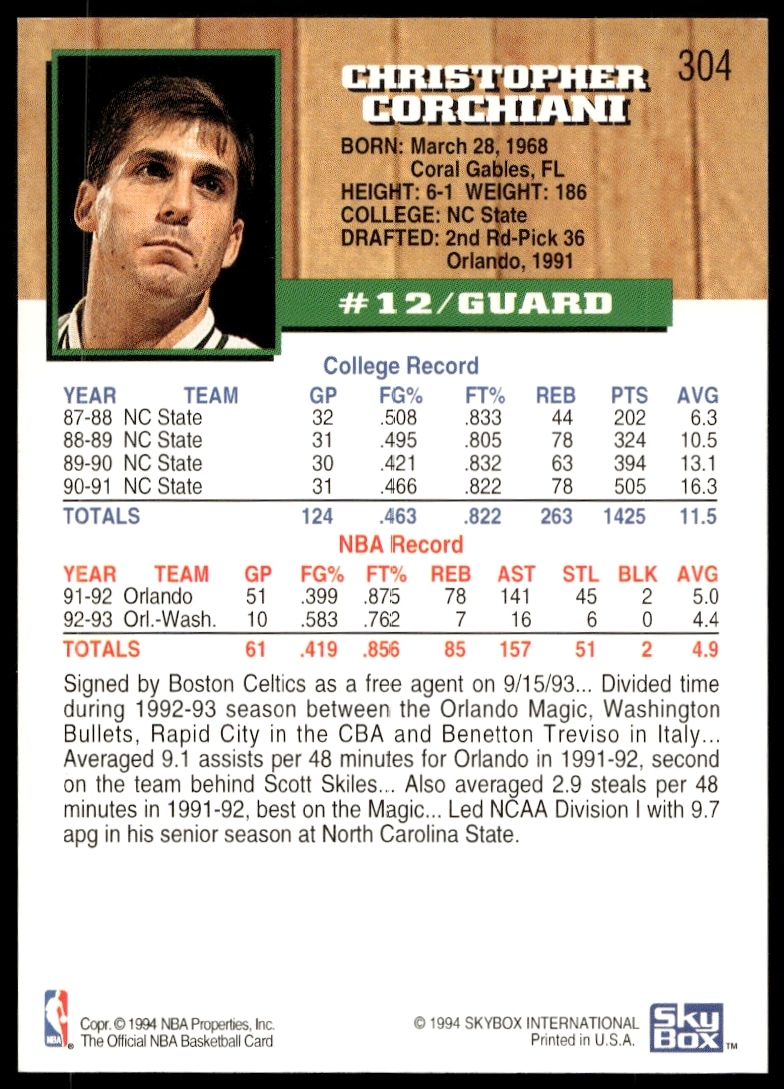 This Basketball card, from 1993-94 is part of the Hoops card set. Chris Corchiani is featured and has a card number of 304.