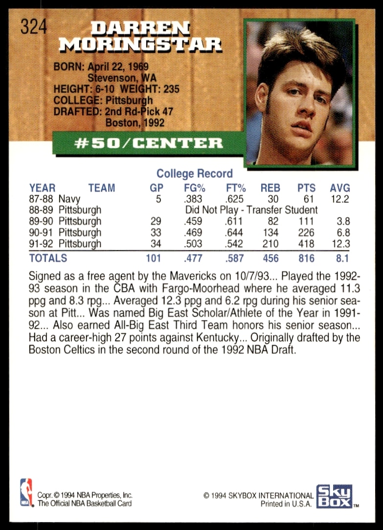 This Basketball card, from 1993-94 is part of the Hoops card set. Darren Morningstar is featured and has a card number of 324.