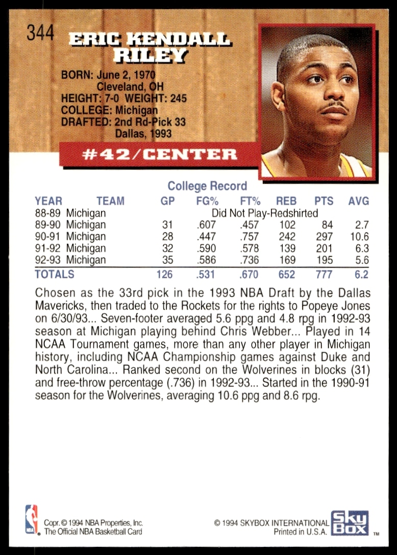 This Basketball card, from 1993-94 is part of the Hoops card set. Eric Riley is featured and has a card number of 344.