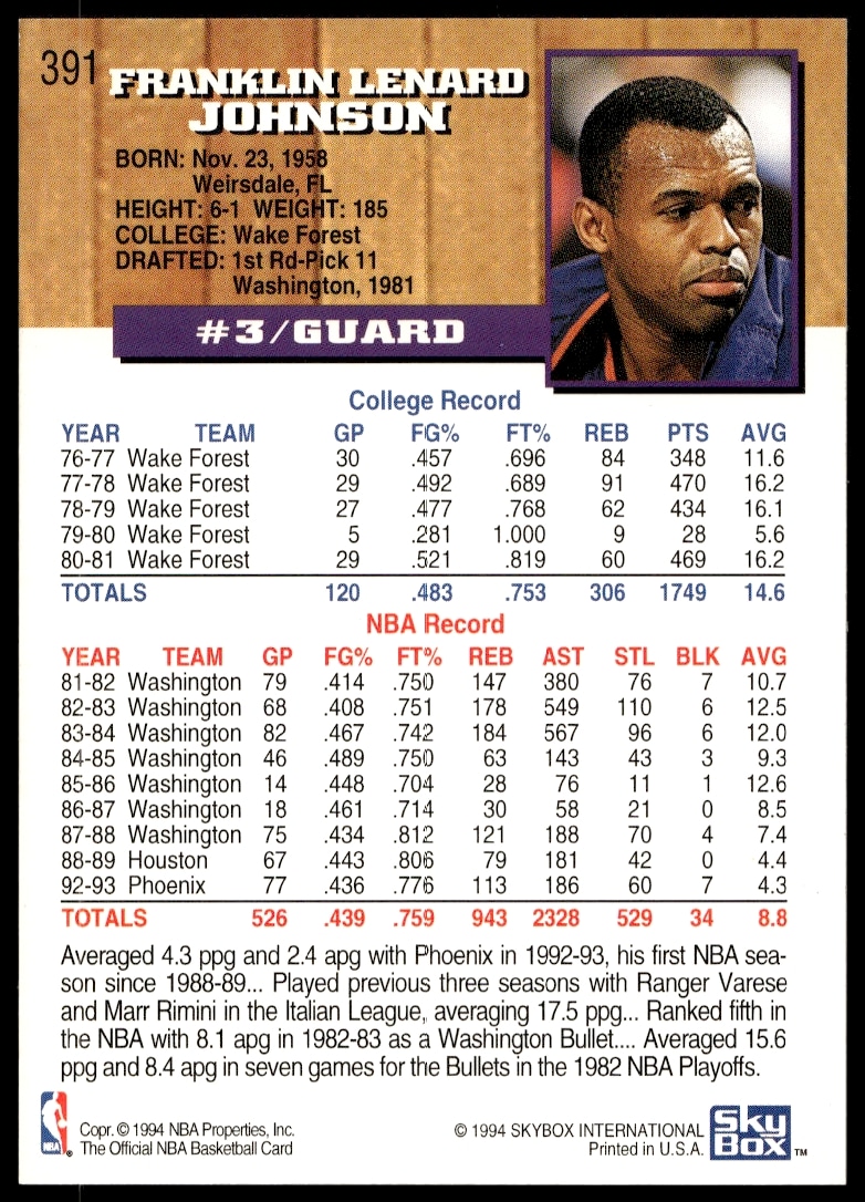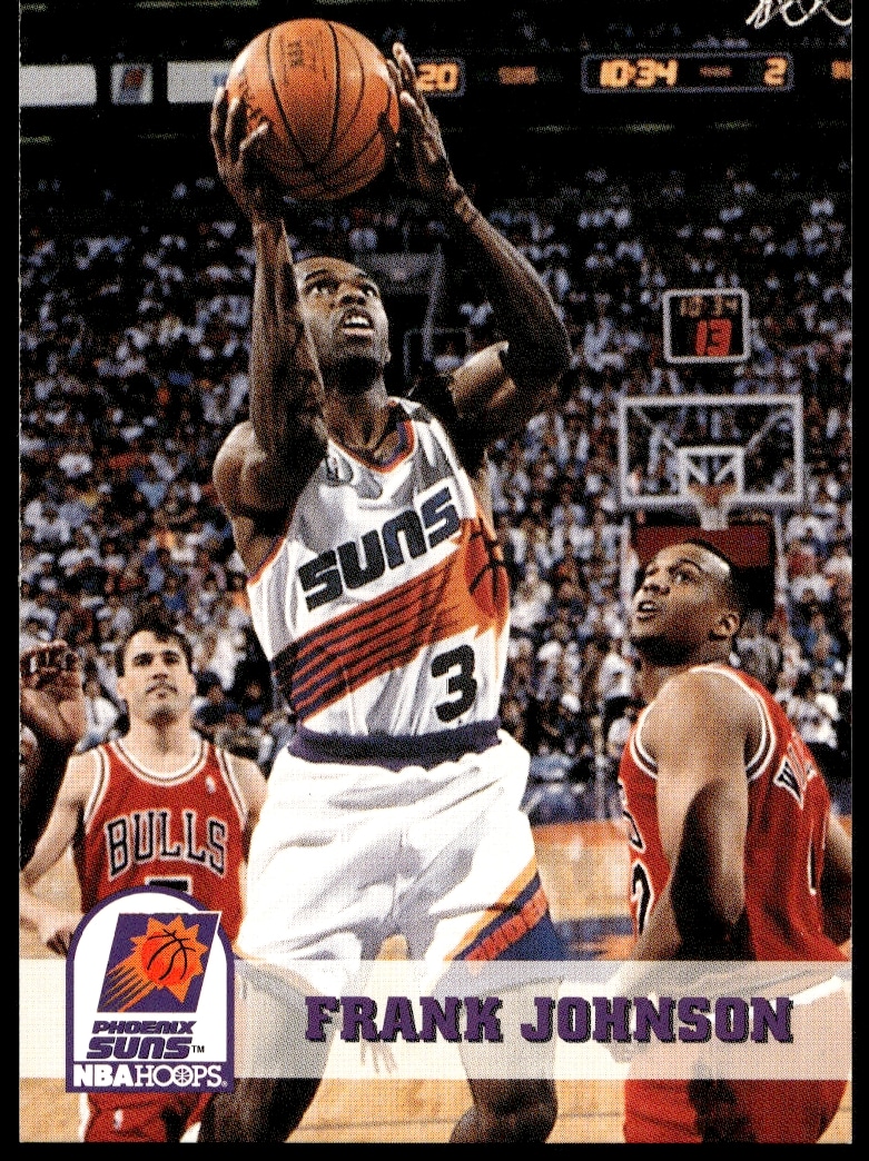 This Basketball card, from 1993-94 is part of the Hoops card set. Frank Johnson is featured and has a card number of 391.