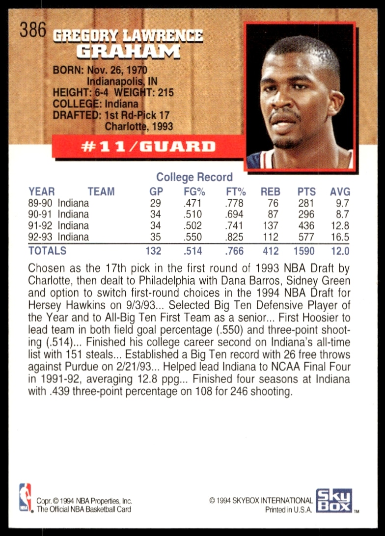 This Basketball card, from 1993-94 is part of the Hoops card set. Greg Graham is featured and has a card number of 386.
