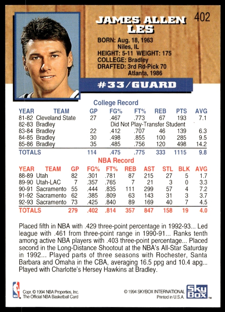 This Basketball card, from 1993-94 is part of the Hoops card set. Jim Les is featured and has a card number of 402.
