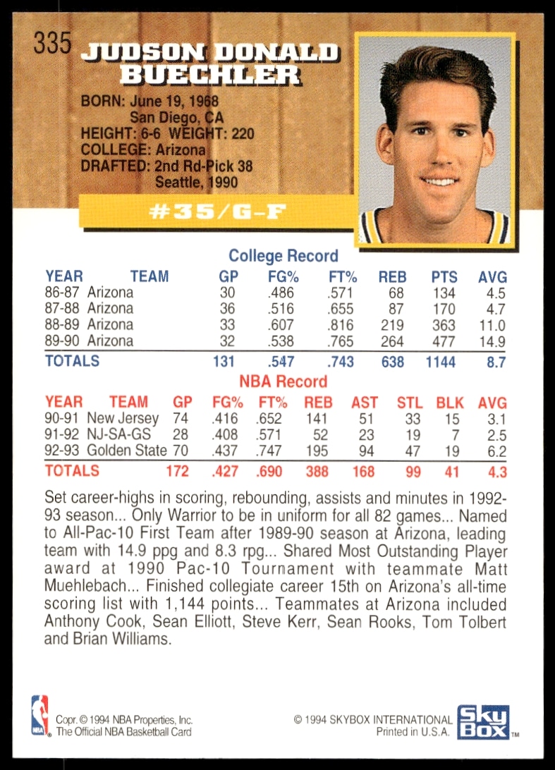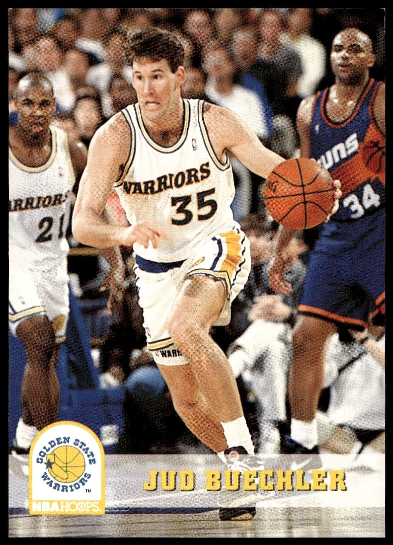 This Basketball card, from 1993-94 is part of the Hoops card set. Jud Buechler is featured and has a card number of 335.