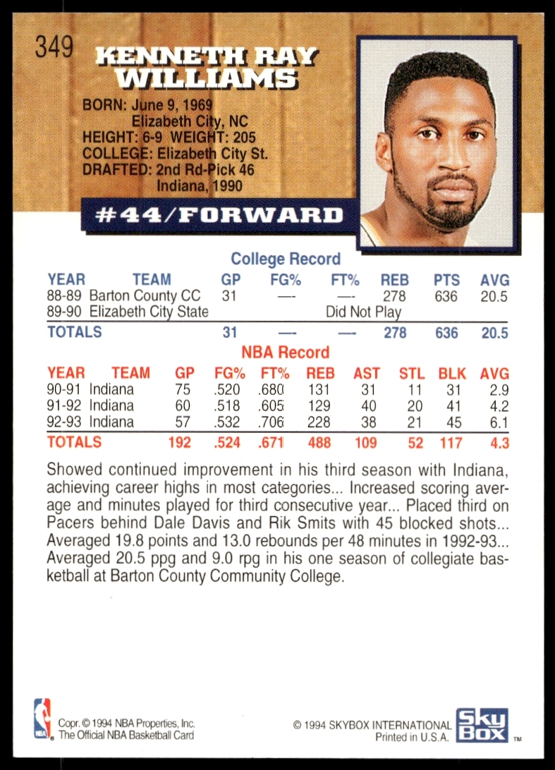 This Basketball card, from 1993-94 is part of the Hoops card set. Ken Williams is featured and has a card number of 349.