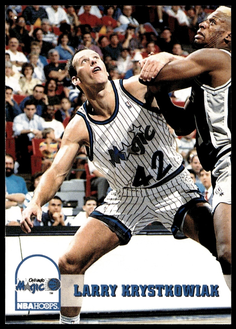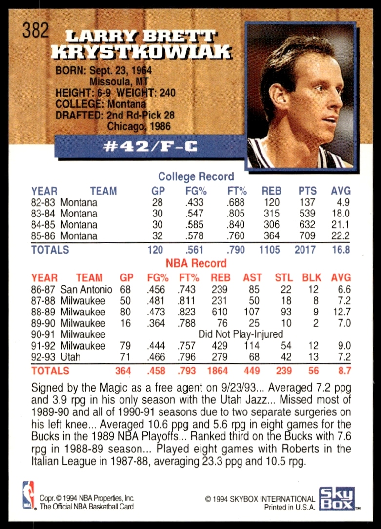 This Basketball card, from 1993-94 is part of the Hoops card set. Larry Krystkowiak is featured and has a card number of 382.