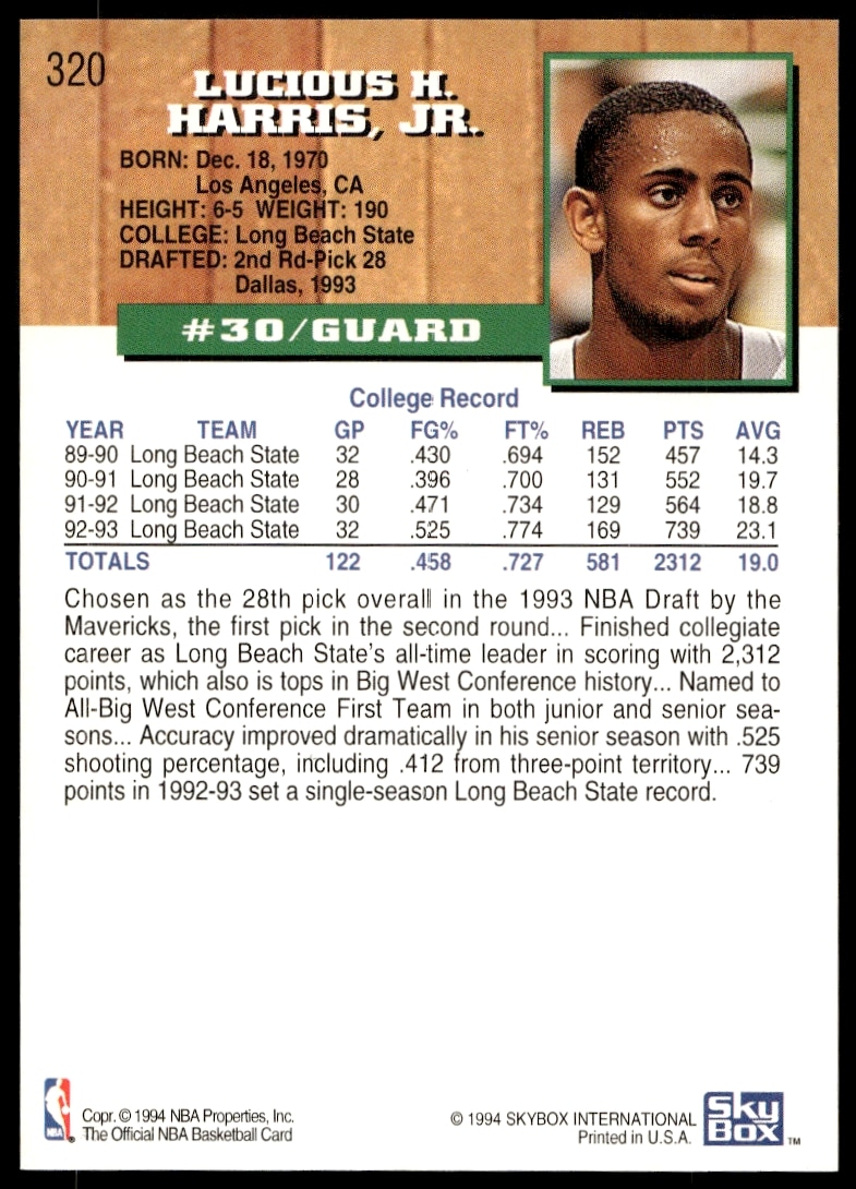 This Basketball card, from 1993-94 is part of the Hoops card set. Lucious Harris is featured and has a card number of 320.