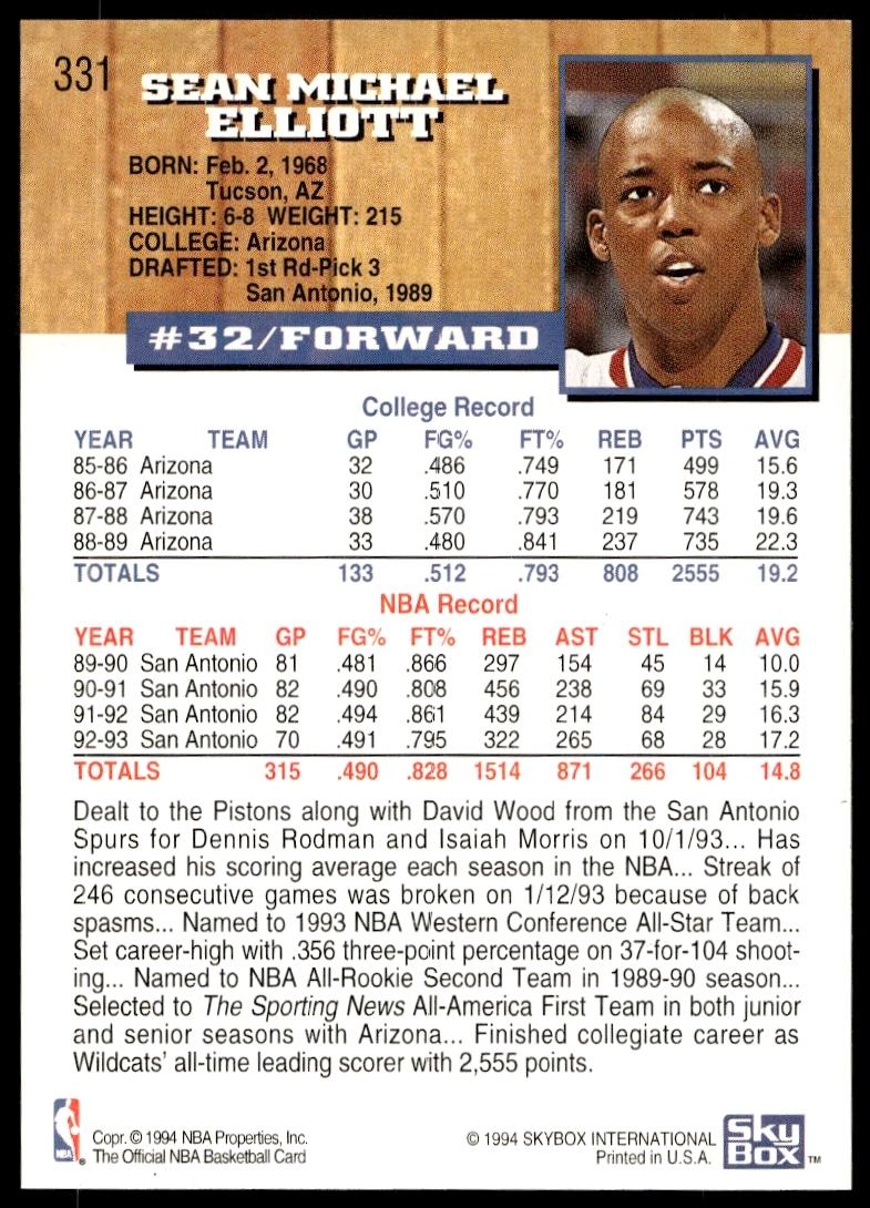 This Basketball card, from 1993-94 is part of the Hoops card set. Sean Elliott is featured and has a card number of 331.