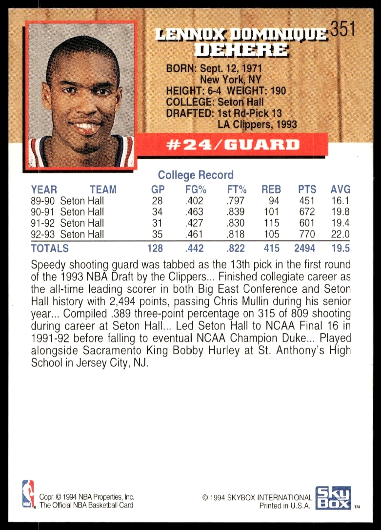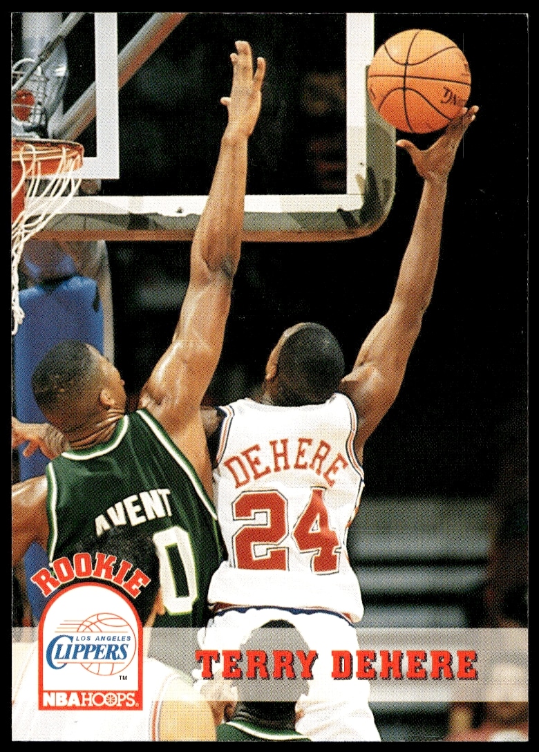 This Basketball card, from 1993-94 is part of the Hoops card set. Terry Dehere is featured and has a card number of 351.