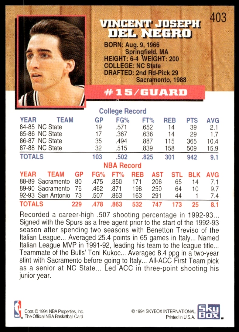 This Basketball card, from 1993-94 is part of the Hoops card set. Vinny Del Negro is featured and has a card number of 403.