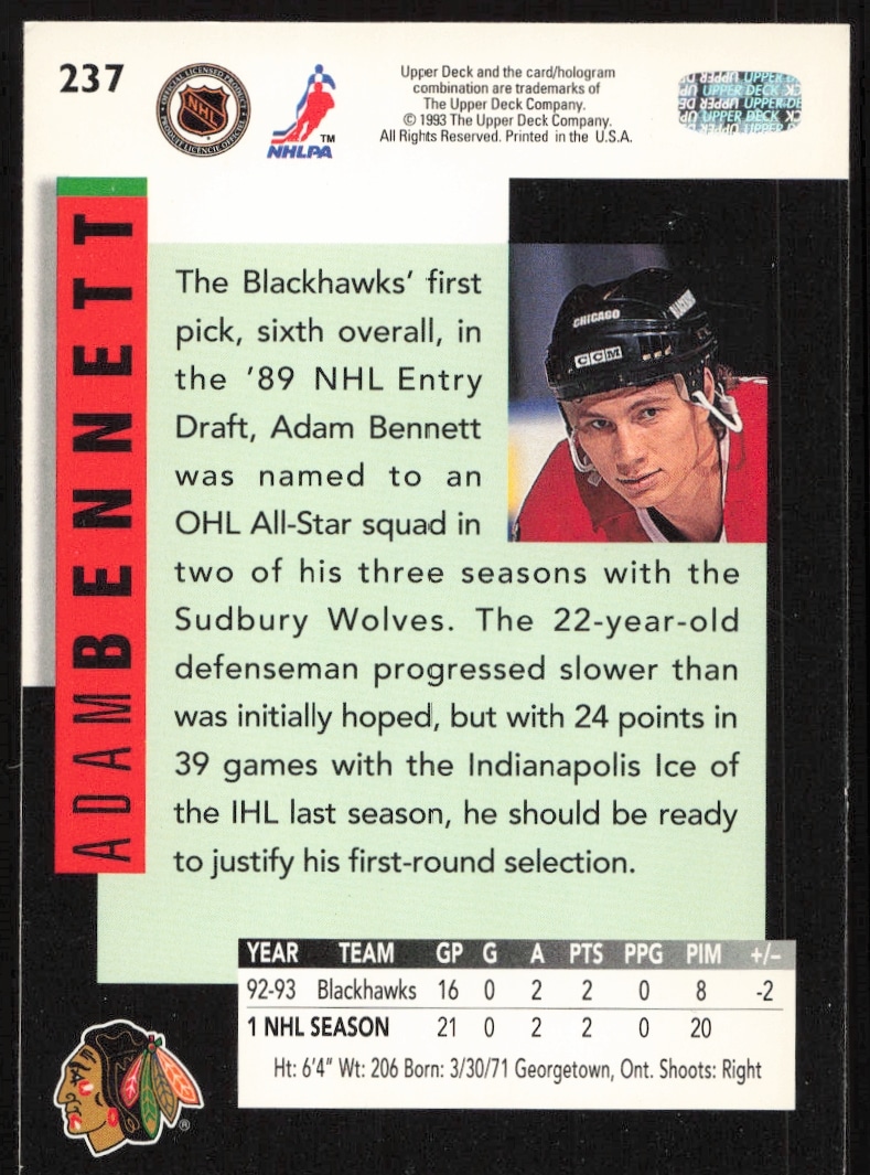 This Hockey card, from 1993-94 is part of the Upper Deck card set. Adam Bennett is featured and has a card number of 237.