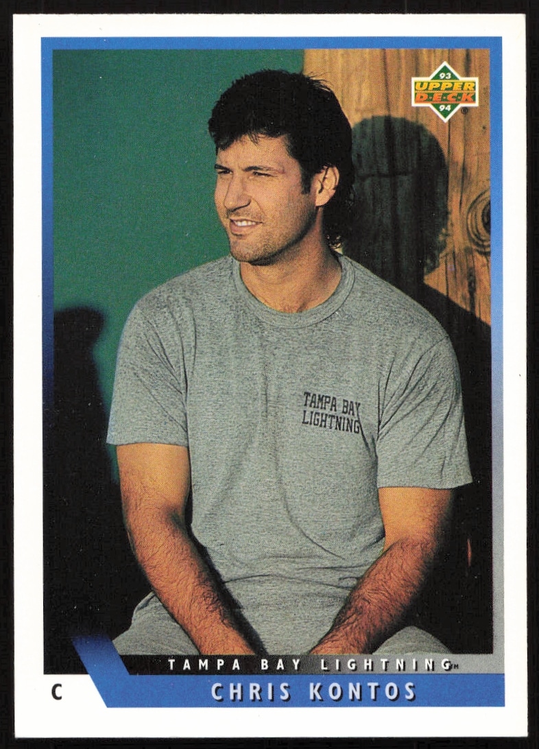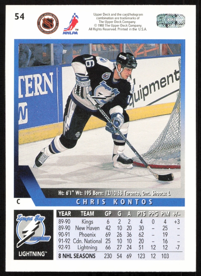 This Hockey card, from 1993-94 is part of the Upper Deck card set. Chris Kontos is featured and has a card number of 54.
