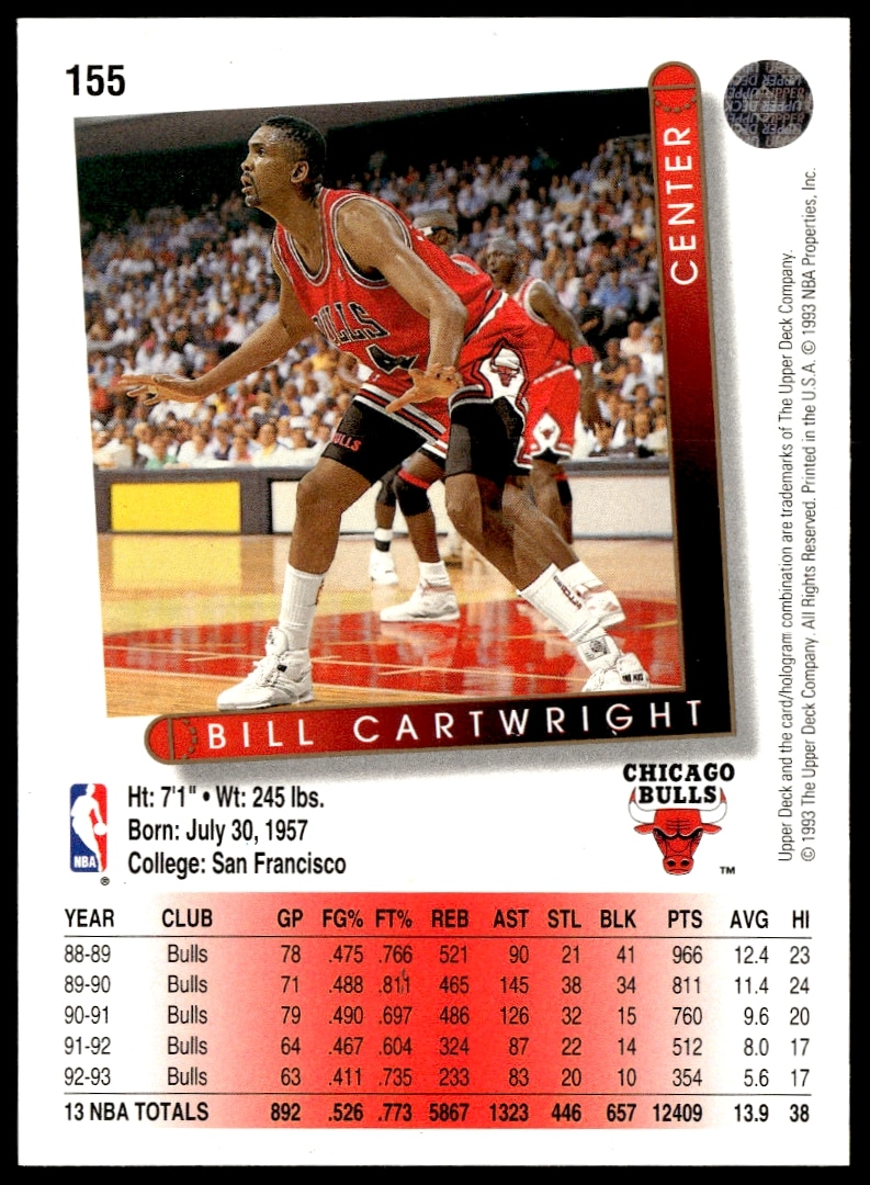 This Basketball card, from 1993-94 is part of the Upper Deck Collector’s Choice card set. Bill Cartwright is featured and has a card number of 155.