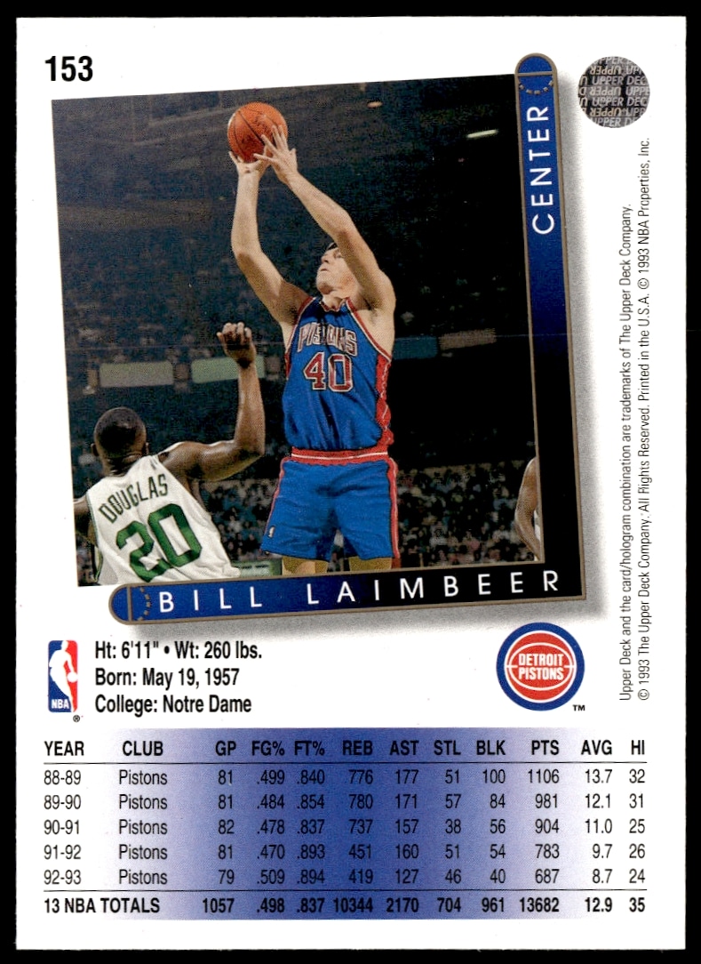 This Basketball card, from 1993-94 is part of the Upper Deck Collector’s Choice card set. Bill Laimbeer is featured and has a card number of 153.
