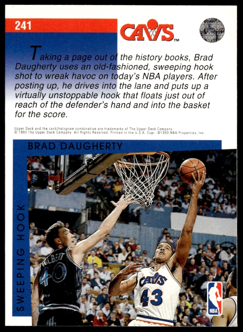 This Basketball card, from 1993-94 is part of the Upper Deck Collector’s Choice card set. Brad Daugherty is featured and has a card number of 241.