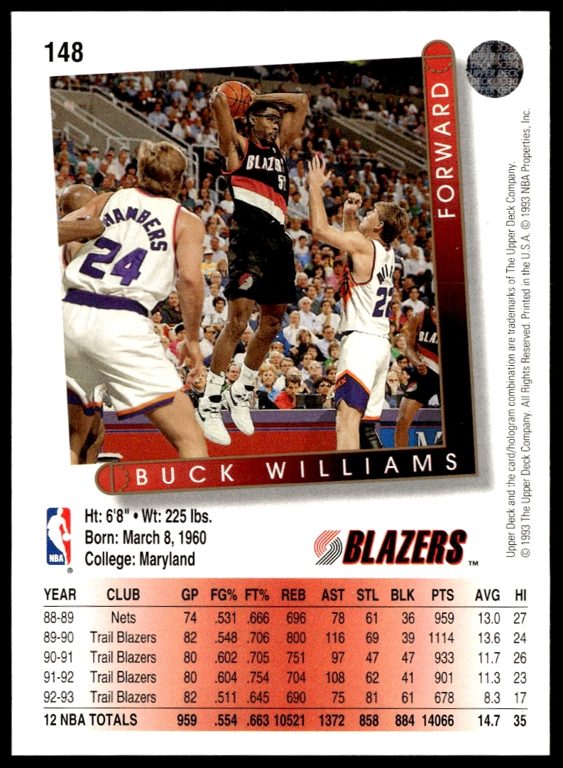 This Basketball card, from 1993-94 is part of the Upper Deck Collector’s Choice card set. Buck Williams is featured and has a card number of 129.