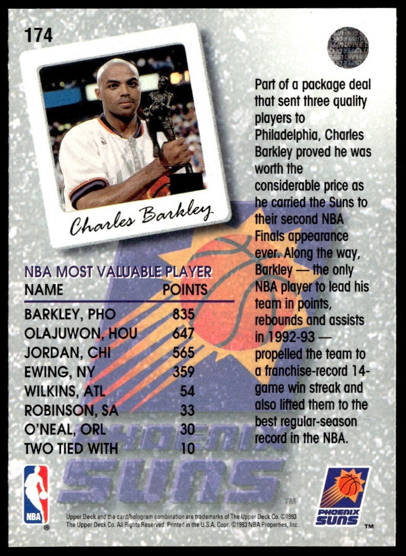 This Basketball card, from 1993-94 is part of the Upper Deck Collector’s Choice card set. Charles Barkley is featured and has a card number of 174.