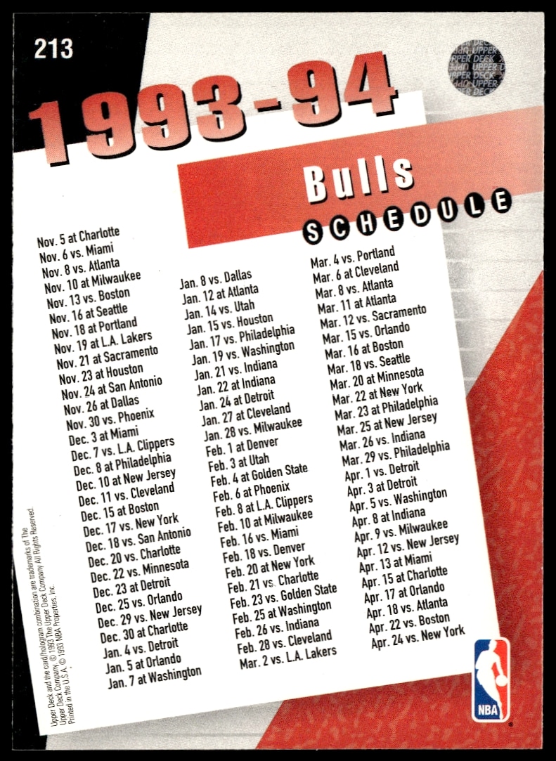 This Basketball card, from 1993-94 is part of the Upper Deck Collector’s Choice card set. Chicago Bulls is featured and has a card number of 213.