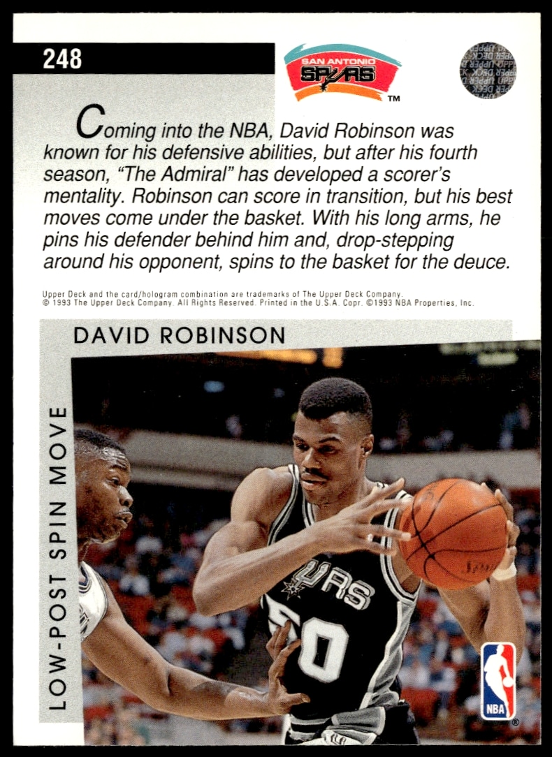 This Basketball card, from 1993-94 is part of the Upper Deck Collector’s Choice card set. David Robinson is featured and has a card number of 248.