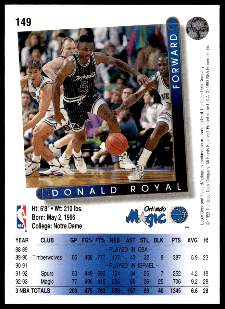 This Basketball card, from 1993-94 is part of the Upper Deck Collector’s Choice card set. Donald Royal is featured and has a card number of 149.