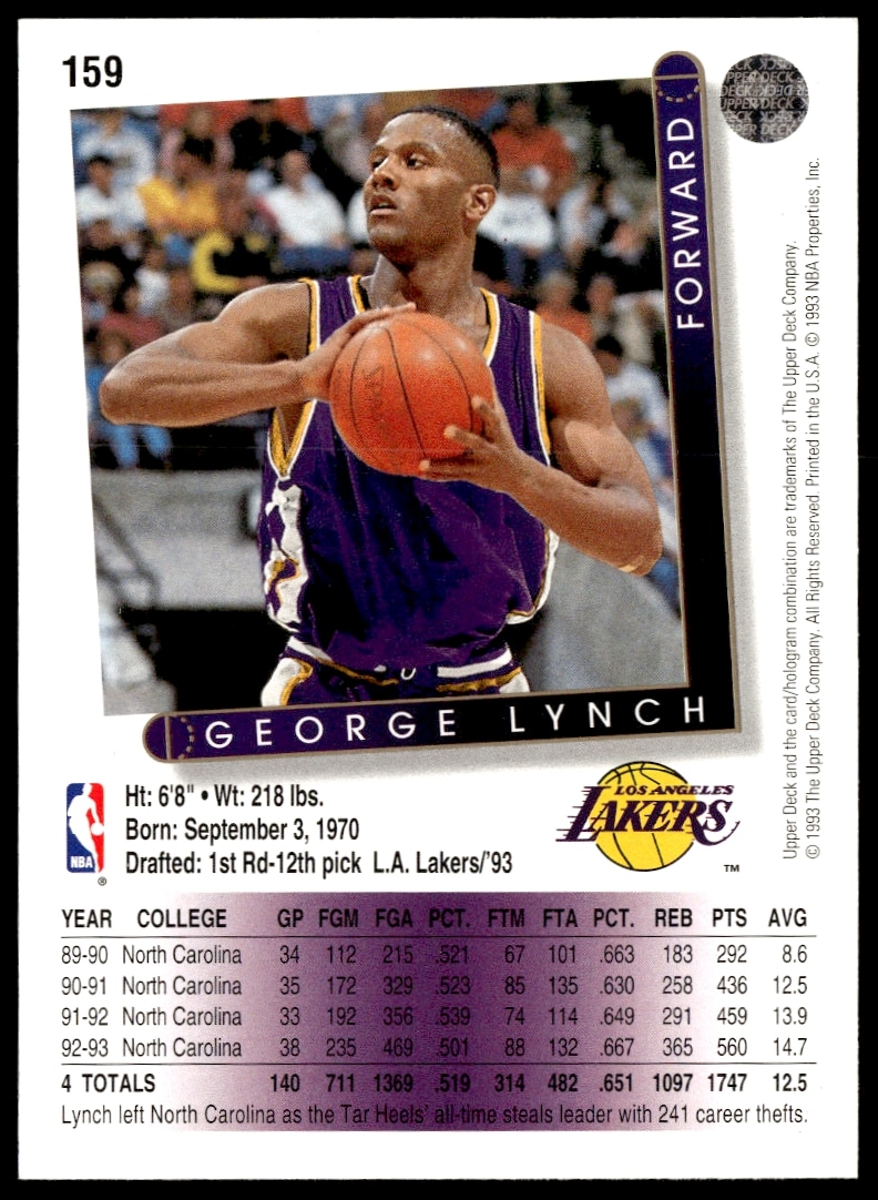 This Basketball card, from 1993-94 is part of the Upper Deck Collector’s Choice card set. George Lynch is featured and has a card number of 159.