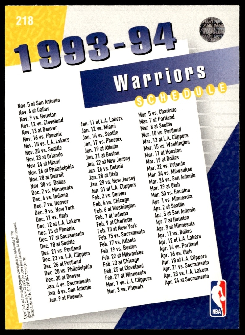 This Basketball card, from 1993-94 is part of the Upper Deck Collector’s Choice card set. Golden State Warriors is featured and has a card number of 218.