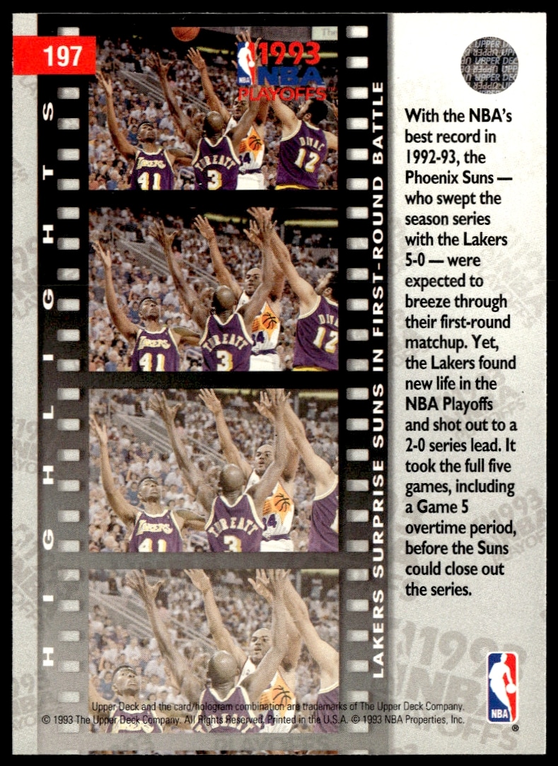 This Basketball card, from 1993-94 is part of the Upper Deck Collector’s Choice card set. Los Angeles Lakers / Phoenix Suns is featured and has a card number of 197.