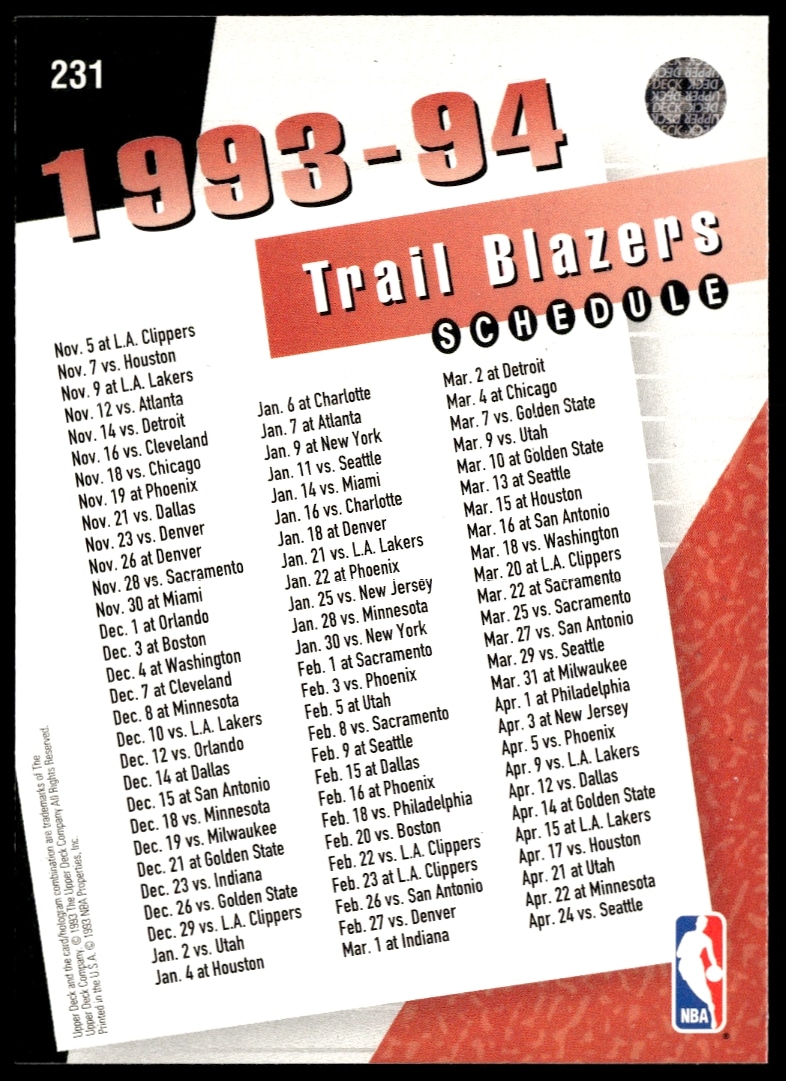 This Basketball card, from 1993-94 is part of the Upper Deck Collector’s Choice card set. Portland Trail Blazers is featured and has a card number of 231.