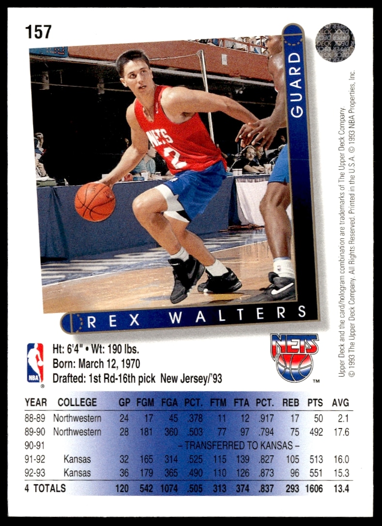 This Basketball card, from 1993-94 is part of the Upper Deck Collector’s Choice card set. Rex Walters is featured and has a card number of 157.