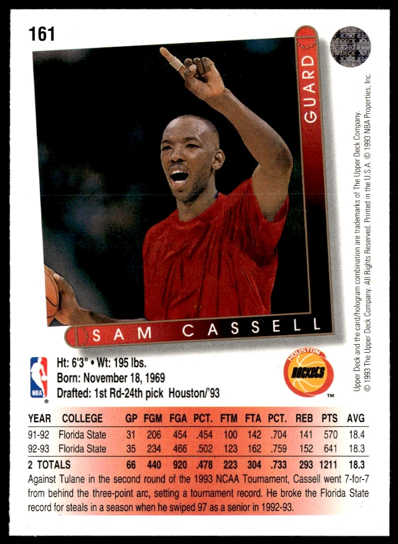 This Basketball card, from 1993-94 is part of the Upper Deck Collector’s Choice card set. Sam Cassell is featured and has a card number of 161.