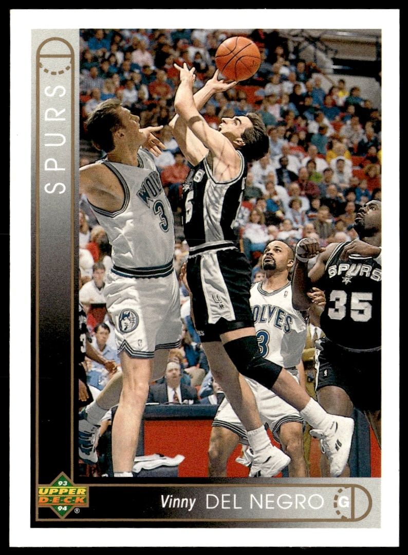 This Basketball card, from 1993-94 is part of the Upper Deck Collector’s Choice card set. Vinny Del Negro is featured and has a card number of 140.
