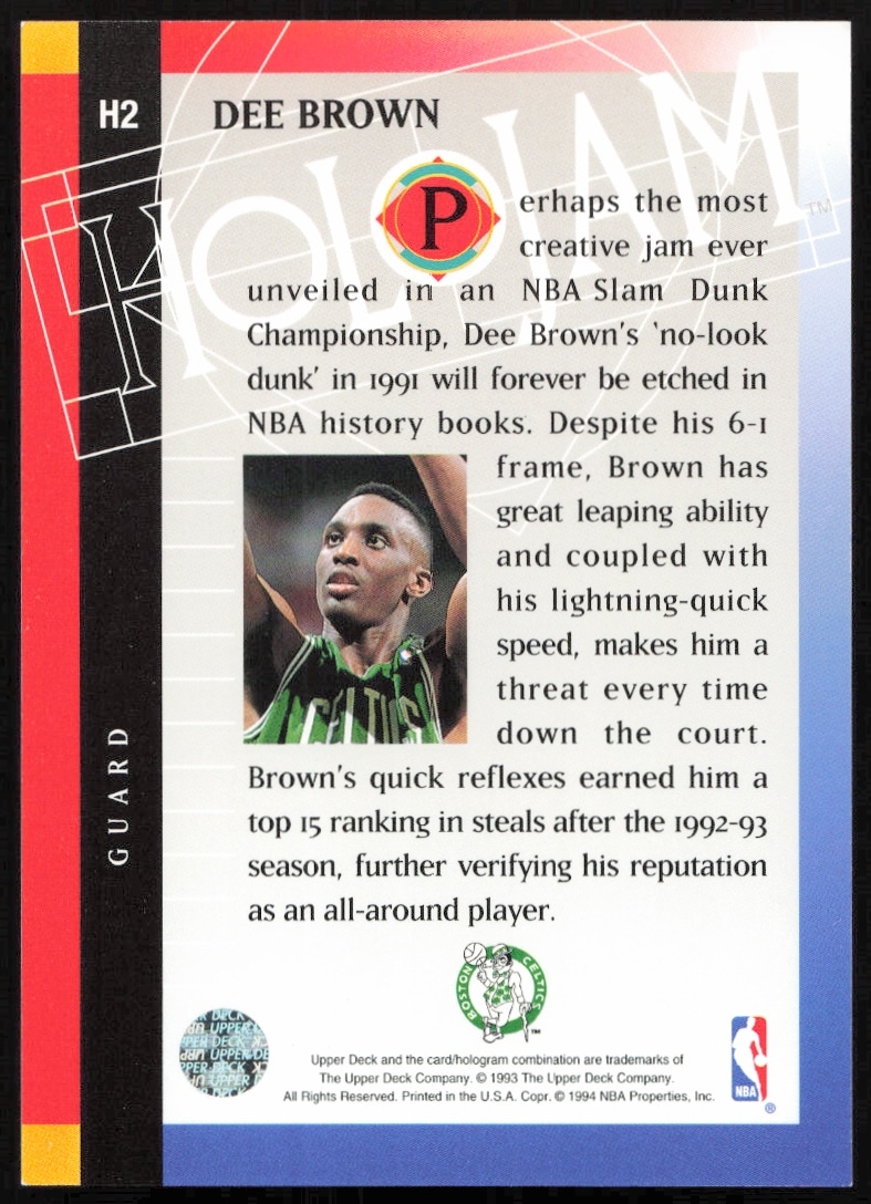 This Basketball card, from 1993-94 is part of the Upper Deck Holojam card set. Dee Brown is featured and has a card number of H2.