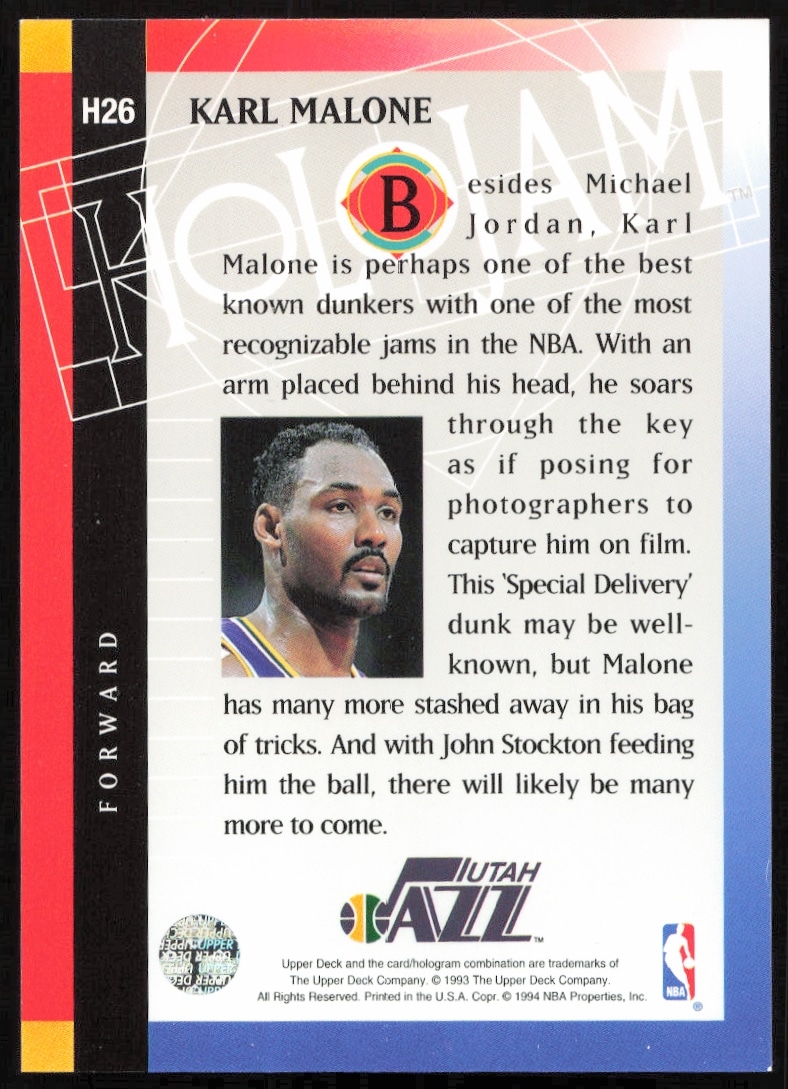 This Basketball card, from 1993-94 is part of the Upper Deck Holojam card set. Karl Malone is featured and has a card number of H26.