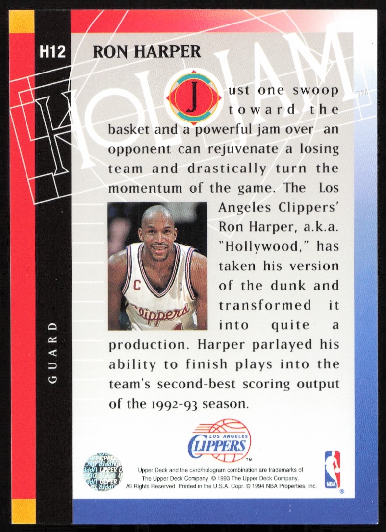 This Basketball card, from 1993-94 is part of the Upper Deck Holojam card set. Ron Harper is featured and has a card number of H12.
