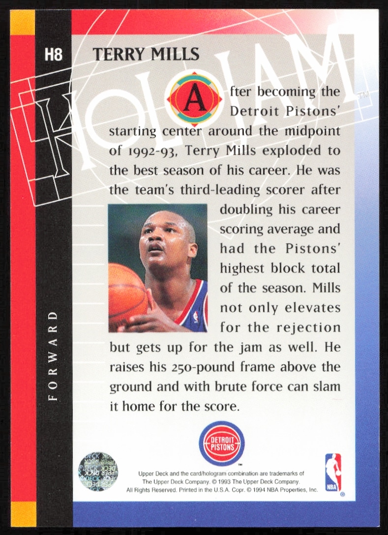 This Basketball card, from 1993-94 is part of the Upper Deck Holojam card set. Terry Mills is featured and has a card number of H8.