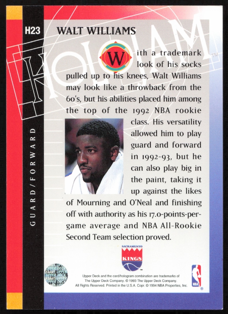 This Basketball card, from 1993-94 is part of the Upper Deck Holojam card set. Walt Williams is featured and has a card number of H23.