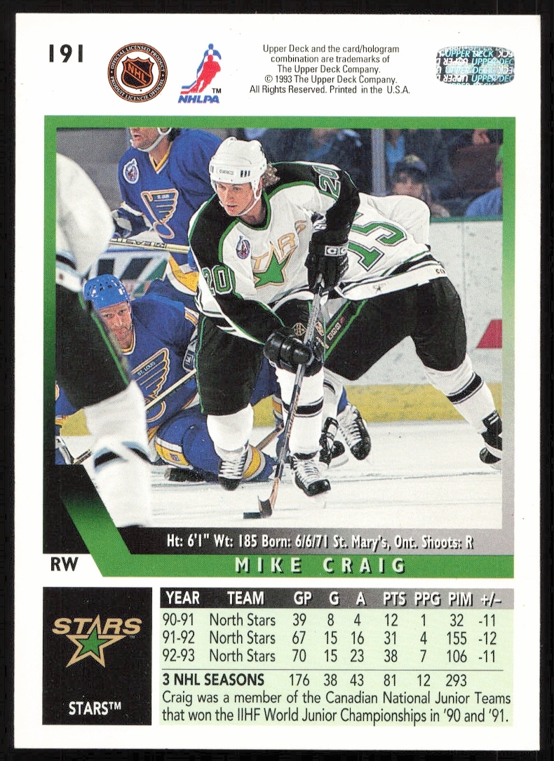 This Hockey card, from 1993-94 is part of the Upper Deck card set. Mike Craig is featured and has a card number of 191.