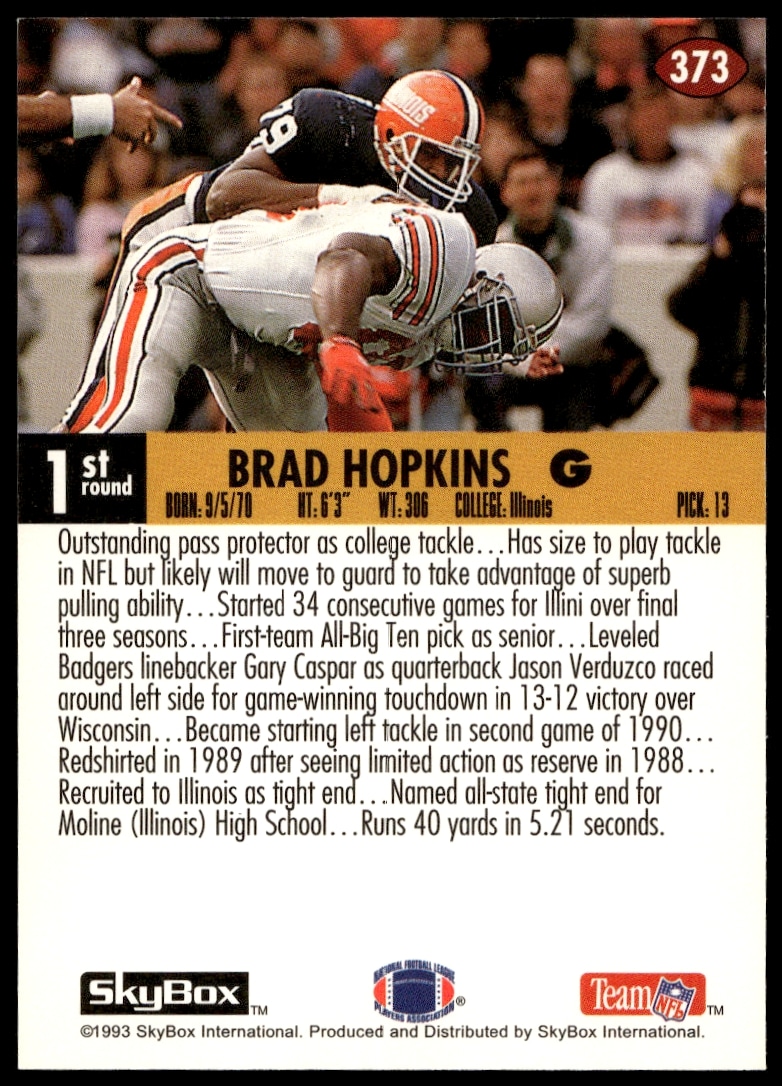 This FootballΒ card, from 1993 is part of the SkyBox ImpactΒ card set. Brad Hopkins is featured and has a card number of 373.