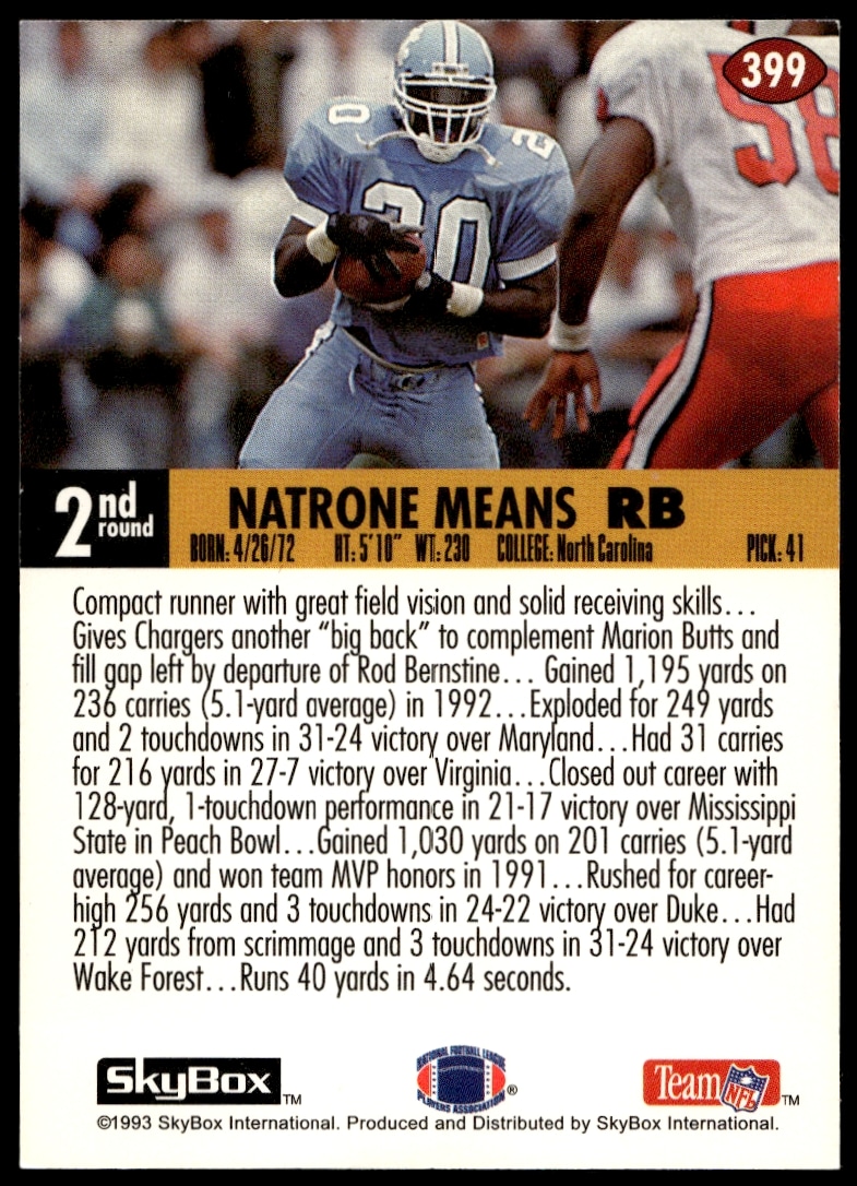 This FootballΒ card, from 1993 is part of the SkyBox ImpactΒ card set. Natrone Means is featured and has a card number of 399.
