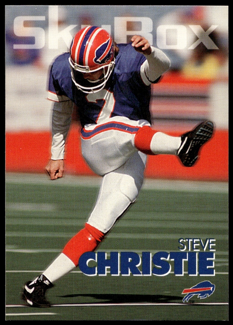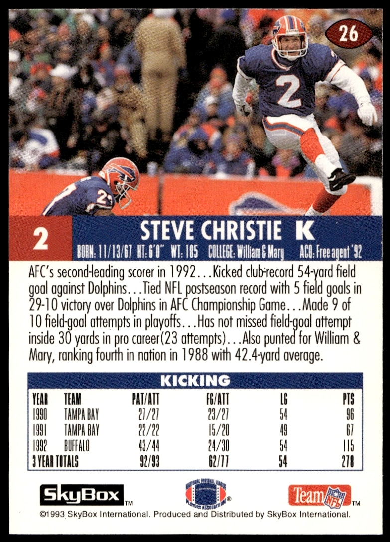 This FootballΒ card, from 1993 is part of the SkyBox ImpactΒ card set. Steve Christie is featured and has a card number of 26.